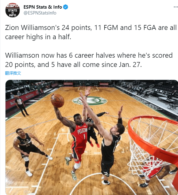 锡安上半场15投11中砍下24分6篮板4助攻,半场得分、命中数和出手数都创造生涯新高;其中禁区得分20+,本赛季前31场15次禁区得分20+比肩奥尼尔成NBA近25年第四人。