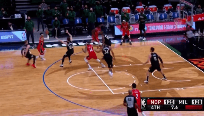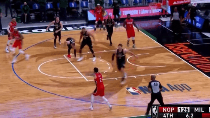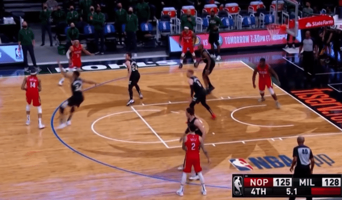 这是末节还剩下14.7秒,雄鹿领先3分,还有球权,字母哥开球给米德尔顿,后者被鲍尔抢断,鲍尔顺势给到了英格拉姆推进,到了外线附近英格拉姆没有投,而是给到了另一边的鲍尔,鲍尔的位置不错,但也没有出手。鲍尔给到哈特,哈特分给英格拉姆,在时间所剩不多的情况下英格拉姆突破到内线,他想要吊给已经过来的锡安。没想到的是裁判示意英格拉姆进攻犯规,因为他撞到了迪文琴佐。随后就是字母哥被犯规,两罚中一之后只剩下1.2秒,比赛结束。