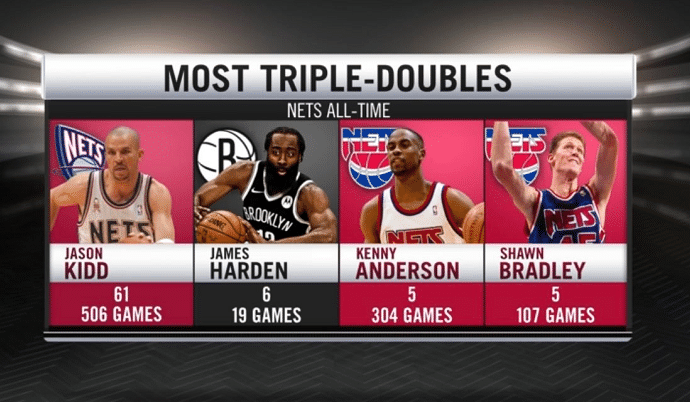 在加盟篮网的第19场比赛中,哈登以6次三双排在队史第二,仅次于基德的61次,恭喜哈登。
