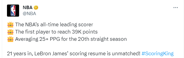 NBA官方也再次祝贺詹姆斯,晒出詹姆斯生涯至今每个赛季的场均得分以及39000分海报,配文写道:NBA历史得分王,第一位达到39000分的球员,连续20年场均25+,21年来,勒布朗-詹姆斯的得分履历无与伦比!