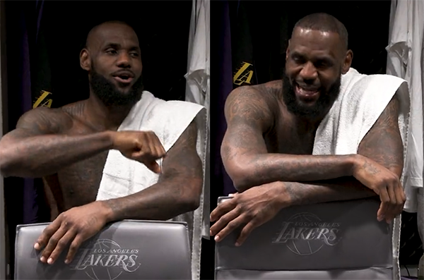赛后,湖人主帅哈姆在更衣室中对着詹姆斯说:布朗,祝贺你达成39000分;哈姆带头鼓掌,更衣室中响起热烈的掌声,詹姆斯连续捶胸回应并且露出笑容。