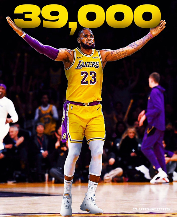 在季中锦标赛湖人大胜爵士的比赛中,詹姆斯第一节凭借一记三分球解锁了39000分里程碑,当时比赛暂停,老詹淡定下场,之后老詹继续带队比赛,三节打卡,出战24分钟,10投6中拿到17分9助攻7篮板,率队轻松获胜,湖人季中赛4胜0负以小组第一的战绩直接晋级八强淘汰赛。