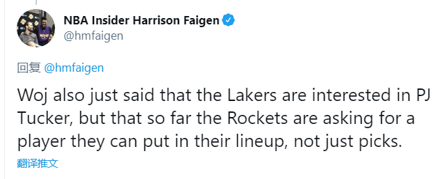 不过湖人对于火箭目前的要价,恐怕有些无能为力。湖人的选秀权没有太大的吸引力,而他们的轮换球员中似乎也只有霍顿·塔克能够成为筹码。而且,现在应该着急的不是湖人,而是火箭。
