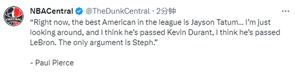 皮尔斯还表示:约基奇是目前NBA联盟最好的球员,但塔图姆真的是联盟最好的美国球员,仅仅库里除外。