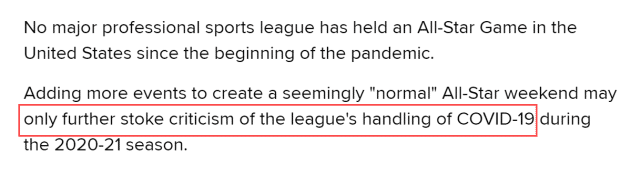 NBA计划在疫情期间举办全明星赛,引起了不少争议,毕竟,其他体育联盟都没有这么做。美媒Bleacher Report指出,在这样特殊的时期,举办看似“正常”的全明星比赛,可能会进一步激起大家对NBA处理疫情举措的批评。