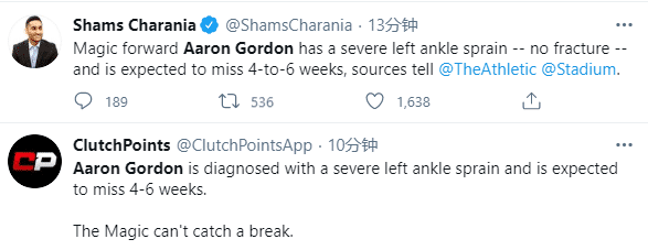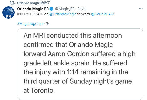 官宣!戈登脚踝严重扭伤,伤停4-6周,魔术真惨:已有多人重伤报销
