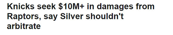 据报道,作为诉讼的一部分,尼克斯正在向猛龙寻求超过1000万美元的赔偿,并辩称NBA总裁亚当-萧华不应该仲裁这场纠纷,部分原因是他与猛龙老板拉里-塔南鲍姆关系密切。