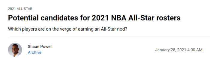 Shaun Powell预测东部的首发阵容是:字母哥、杜兰特、恩比德、比尔和布朗。替补阵容是:塔图姆、小萨博尼斯、兰德尔、哈登、特雷-杨、拉文、阿德巴约。另外,东部仍有希望竞争全明星位置的球员还包括米德尔顿、本-西蒙斯、布罗格登、欧文、塞克斯顿和海沃德。
