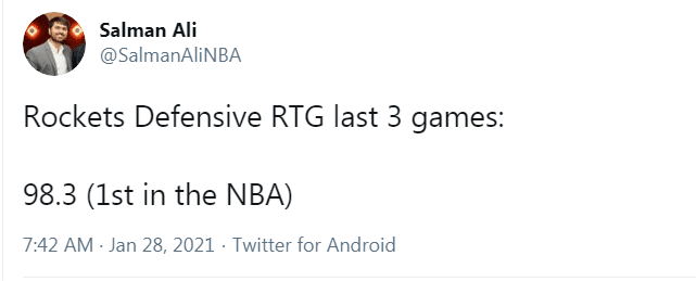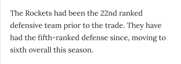 告别哈登后,火箭的防守进步有多大?《休斯顿纪事报》名记费根给出了另一组数据:交易哈登前,火箭的防守效率只排在联盟第22位,交易哈登后,他们的防守能排到联盟第5位。赛季整体防守效率已经升至联盟第6的水准。这真的是相当明显的进步!戈登认为火箭应该继续在防守端打出侵略性,至少成为一支季后赛球队。