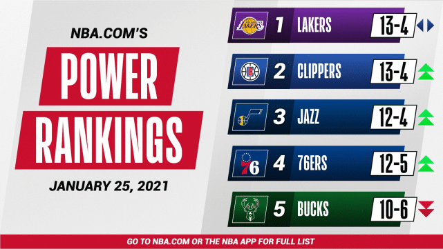 来源:24直播网01-26 10:1624直播网讯 北京时间1月26日,NBA官方公布了第6周的战力排行榜。湖人第一快船第二,近来势头很猛的爵士冲到第三。和上周相比,篮网、勇士和火箭的排名变化不大,篮网从第7位掉到第8位,勇士从第13位掉到第14位,火箭则从第24位升至第22位。