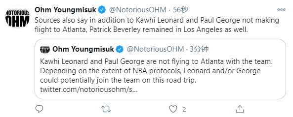 快船即将迎来残酷的六连客,小卡和乔治都将缺席六连客的第一场比赛,贝弗利因右膝酸痛也缺席比赛,他们三人都没有随队前往亚特兰特,目前都留在洛杉矶;贝弗利因伤缺席比赛,但小卡和乔治相当于被隔离在洛杉矶,只要他们的检测结果通过时才能重返赛场。