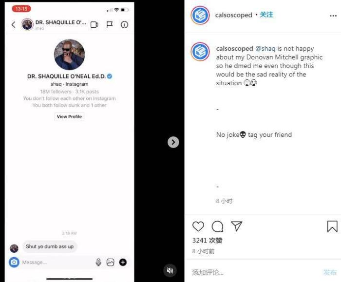 来源:24直播网01-25 15:0624直播网讯 北京时间1月25日,一位网友晒出了爵士球员米切尔隔扣奥尼尔的P图照,NBA传奇很不开心,大鲨鱼直接私信这位网友附文:闭上你的臭嘴!