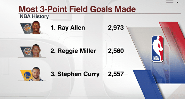 库里仅用715场比赛就创造2561记三分神迹,当时NBA传奇神射雷吉-米勒足足打了1389场比赛,相比之下,库里足足比米勒少用了674场比赛,也比当年创下纪录的米勒年轻将近7岁。