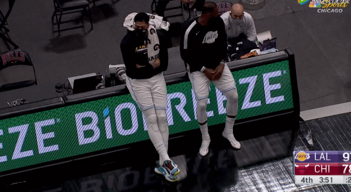 由于早早打卡下班,詹姆斯和浓眉都坐在场边桌子上看比赛,其中36岁詹姆斯早已脱掉战靴,连拖鞋都没穿,直接穿着袜子坐等比赛结束。