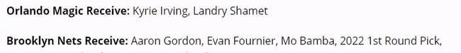 于是美国体育媒体建议篮网送出欧文和沙梅特,从魔术换来戈登、富尼耶、班巴、2021和2024以及2026年的首轮选秀权。