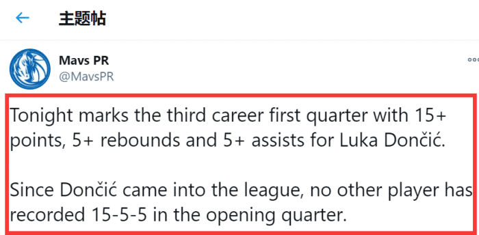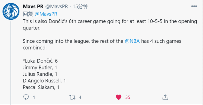 值得一提的是,据独行侠官方统计,这是东契奇生涯第3次在首节送出至少15+5+5的数据,自从他2018年进入NBA以来,同时期全联盟还没有人能做到这一点!换句话说!东契奇最近3个赛季3次首节15+5+5,其他球员是0次!