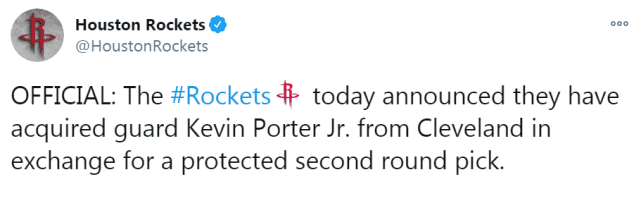 为了给小波特腾出位置,火箭裁掉了已经因伤赛季报销的克莱蒙斯。小波特也在个人IG社媒资料上加入了H-TOWN(休城)的字样,并配上了一个火箭表情。