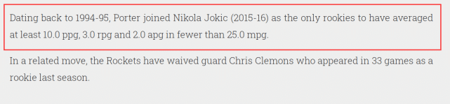 值得一提的是自从1994-95赛季以来,NBA只有两名球员在新秀赛季出场不到25分钟的情况下能够得到至少10分3篮板2助攻的数据,一位是小波特,另一位就是掘金的约基奇。约基奇在2015-16赛季出场80场,其中55场首发,场均打21.7分钟,贡献10分7篮板2.4助攻。