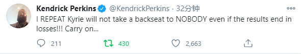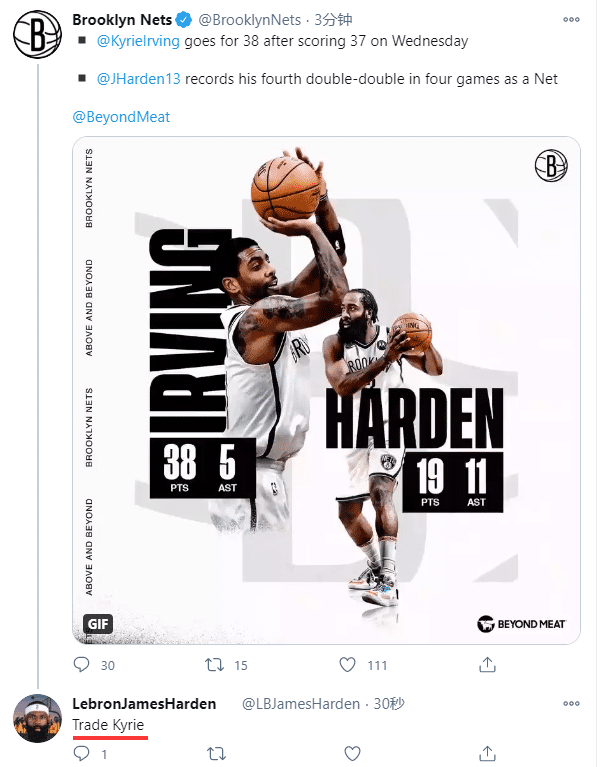 欧文连续两场轰下35+,一场37分一场38分,可欧文复出后遭遇两连败,赛后名嘴帕金斯直言即使篮网输球,欧文也不会向任何人屈服;美球迷更是到篮网官推评论区留言:交易欧文!