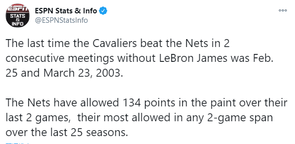 据统计,骑士上一次连续两场击败篮网是2003年2月26日和3月24日,当时是新秀詹姆斯带领骑士连杀篮网;篮网两场比赛禁区狂丢134分,成为NBA近25年两场最大丢分;与此同时,塞克斯顿创纪录,开场前10场全都得分20+成队史第一人。