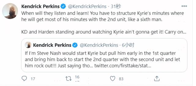 帕金斯更新推特“如果我是史蒂夫-纳什的话,我会把欧文摆在首发,但是在第一节末我会把他换下,让他在第二节一开始的时候带着第二阵容发挥作用!你必须把欧文的大部分时间和第二阵容安排在一起,就类似于第六人的角色一样。KD和哈登杵在那里看着欧文运球然后投篮是行不通的!”关键词:改变轮转