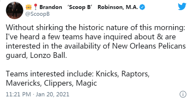 来源:24直播网01-21 15:3224直播网讯 北京时间1月21日,据NBA记者布兰登-罗宾逊报道,新奥尔良鹈鹕的控卫朗佐-波尔(球哥)引起了不少球队的兴趣,尼克斯、猛龙、独行侠、快船和魔术都已联系鹈鹕,询价球哥,探讨交易他的可能。