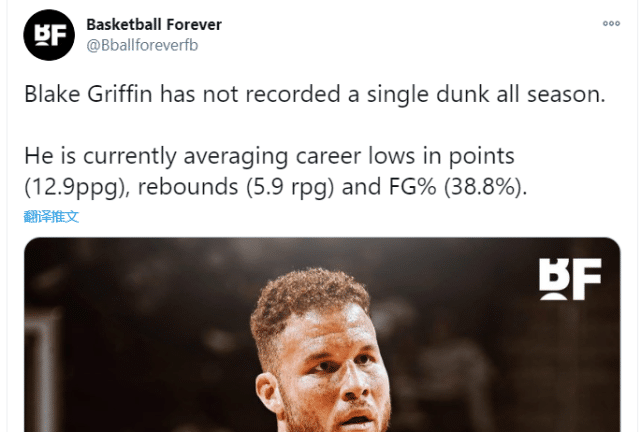 24直播网讯 北京时间1月20日,美媒Basketball Forever晒出了一组数据:本赛季至今,布雷克·格里芬没有过任何的扣篮记录!而本赛季,格里芬的多项数据也降至生涯谷底,包括场均得分以及命中率!对于这位尚未年满32岁的昔日状元来说,他的职业生涯恐怕很难再重回巅峰了。