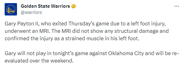 在上一场勇士输给雷霆的比赛中,小佩顿前场抢断后上篮不进,补篮落地时踩到霍姆格伦的脚,导致自己的左脚扭伤,坚持罚球后一瘸一拐离场并且返回更衣室接受检查,X光成阴性(没有骨折),早早退出比赛;现在伤情确诊为左脚肌肉拉伤,周末复查,暂无具体复出时间。