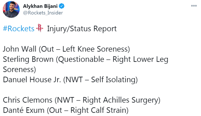 24直播网讯 北京时间1月20日,火箭没有在这一天安排训练,但是公布了最新的伤病名单。沃尔左膝酸痛,无缘下一场对太阳的比赛,这将是他连续第四场缺阵。斯特林-布朗右腿酸痛,状态是Questionable(出战成疑,50%可能登场)。豪斯自我隔离,克莱蒙斯赛季报销,两人都没有随队。埃克萨姆右腿拉伤,也将缺席比赛。