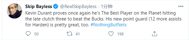 名嘴贝勒斯发推写道:杜兰特再次证明他是星球上最好的球员,一记关键三分击败了雄鹿,他的新控卫(哈登12次助攻)也相当出色。