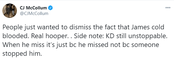 赛后杜兰特和哈登瞬间引热议,开拓者球星CJ-麦科勒姆发推写道:人们只是想忽略詹姆斯冷血的事实。真正的篮球运动员。PS:KD依然势不可挡,当他想得分时没有人可以阻挡他。