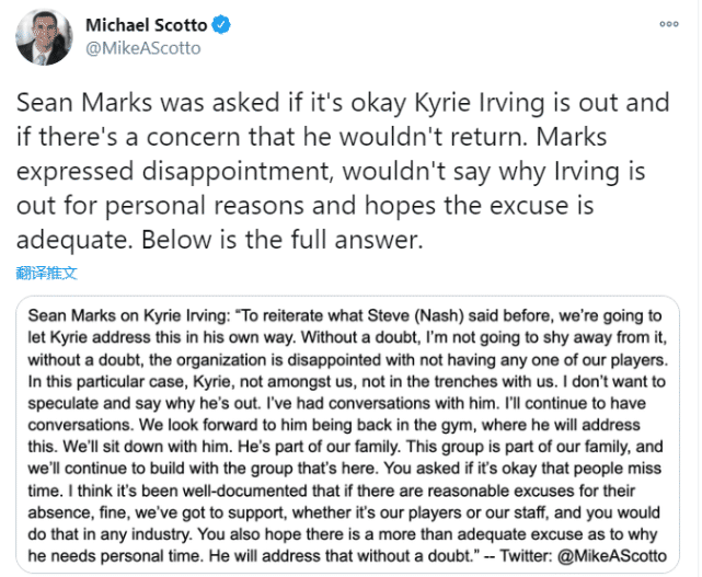 此前,篮网的主帅和队友们纷纷表示,他们直到欧文缺席比赛的原因,但没有对媒体透露太多。但从马克斯的表态来看,球队目前对于欧文缺席的真正原因还不是太清楚,或者是不太满意,否则他不会让欧文再度解释缺席原因。