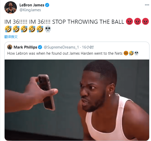 来源:24直播网01-15 09:5024直播网1月15日讯 此前詹姆斯表示对火箭把哈登交易到篮网没有太大反应,不过看到有人恶搞自己对哈登的夸张反应,詹姆斯转发视频并正式回应:我36岁了!我36岁了!别再扔球了!还配上:3个发怒生气和5个哭笑不得表情。