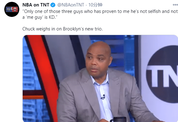 巴克利表示杜兰特脱离了水花兄弟,去联手了运球兄弟,并且质疑哈登和欧文太自私,直言篮网三巨头之中只有杜兰特一个人不自私。