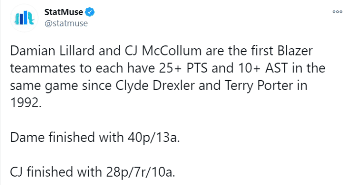 据统计,利拉德和麦科勒姆还是NBA历史首对单场均送出至少25分10助攻5记三分的球员!除此之外,两人也是开拓者队史自1992年以来首对单场同时送出25分+10助攻的组合,上一对是德雷克斯勒和特里波特!