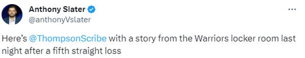 对于勇士5连败,卢尼接受采访时表示:我不会说我非常担心,我想,当然你可以说这有点让人担忧,因为你不能在主场输掉这样的比赛。但我认为我们已经足够优秀,足以把一些事情弄明白。