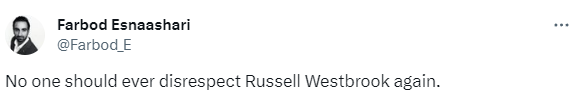 快船记者Farbod Esnaashari发推表示:至此,所有人都应该给威少尊重。你知道威少自愿当替补是怎样一种特殊的牺牲吗?他此前曾是联盟效率最佳首发五人、最佳三人组之一,他在上赛季季后赛的表现非常出色,而且接受了减薪,大多数人不会愿意像他这样做。