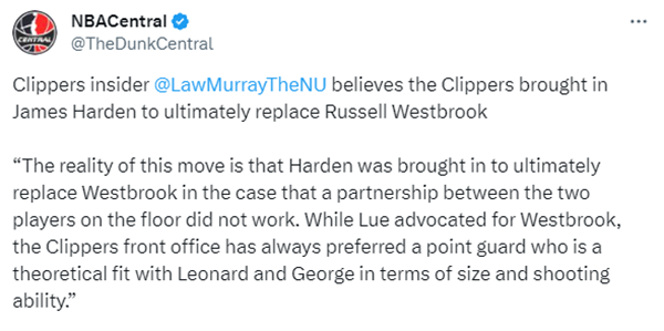 Murray还表示:哈登最终成为了威少的上位替代者,以防两人同时出场时效果不佳(两人一起出战85分钟,快船净输36分)。虽然卢很支持威少,但快船管理层一直更想要一位在身高和投射方面与小卡、乔治理论上更合拍的控球后卫。上赛季交易截止日前,快船管理层认为埃里克-戈登是那个人。今夏,快船曾尝试得到布罗格登,即便当时威少已与球队续约。快船还曾一度对霍勒迪很感兴趣。