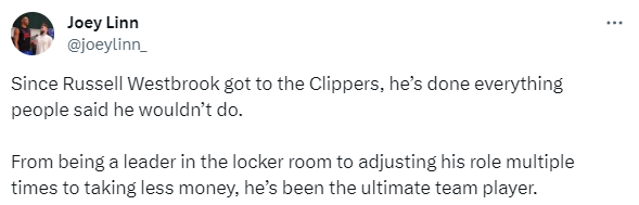 快船记者Joey Linn发推写道:自从威少来到快船,他已经做了所有人们说他不会做的事情。从更衣室的领袖,到多次调整自己的角色,再到拿更少的钱,他已经成为了终极的团队球员。