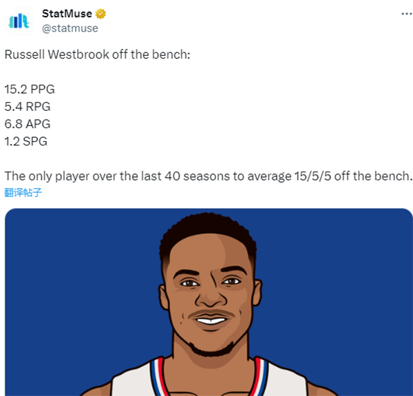 在个人生涯以替补出战的场次中,威少场均能拿下15.2分5.4篮板6.8助攻1.2抢断,为联盟过去40年唯一一位能够替补场均砍下至少15分5篮板5助攻的球员。