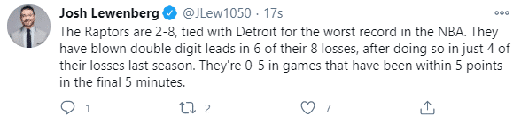 此役过后,猛龙的战绩已经下滑到了2胜8负,战绩追平了东部排名倒数第一的活塞,来到了东部倒数第二。值得一提的是,在这8场失利中,猛龙共有6次在领先10+的情况下被对手翻盘,堪称“被逆转之王”。而上赛季一整个赛季,猛龙只有4次10+领先被逆转。