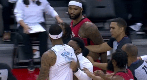 这一节的湖人取得了梦幻开局,比分一度来到了12分,比赛中后段火箭这边逐渐找回了手感,一波小高潮里过后分差被缩小到了4分,替补登场的考辛斯发挥不错,他上场后连续命中三分,但是这一节的比赛还剩2分钟的时候,莫里斯先是推倒泰特,随后考辛斯替队友出头推倒了莫里斯,莫里斯追着考辛斯要干仗,最终两人各领到一个技术犯规,大莫还领到一级恶意犯规。