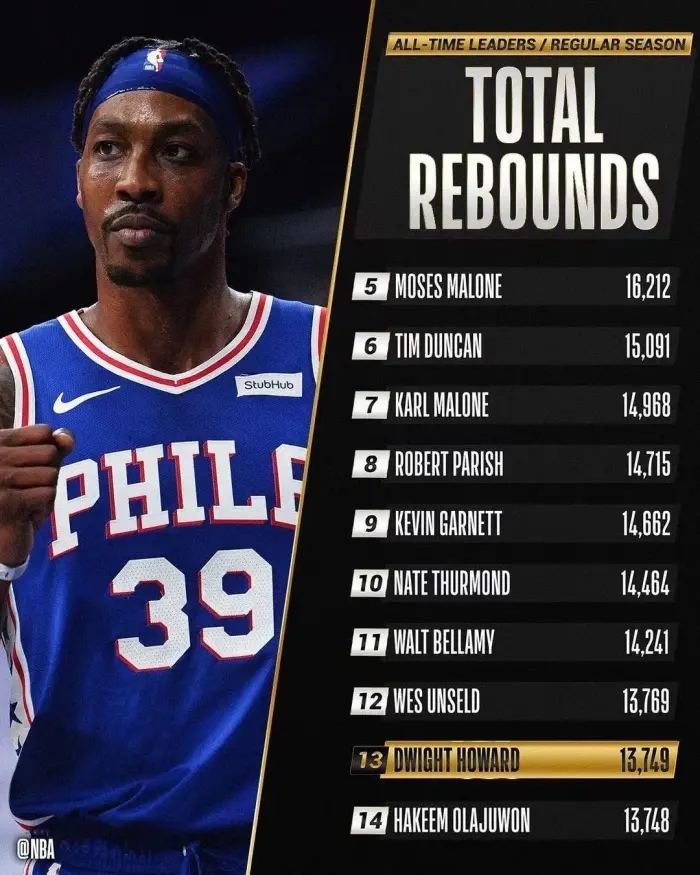 如此一来,魔兽的生涯常规赛总篮板数达到13749个,超越奥拉朱旺(13748个),上升至历史的第13位。