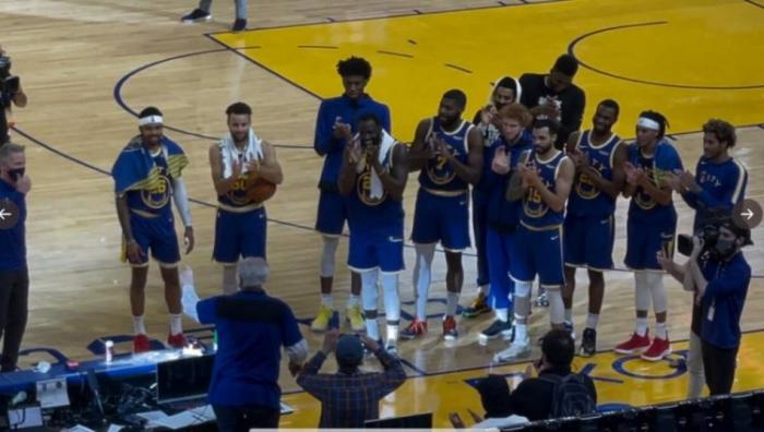 勇士上下都很开心,赛后勇士们众将比赛用球送给为金州勇士工作长达58年之久的官方记分员Fred Kast,并与他合影留念。Kast老爷子今年82岁,在今天的比赛过后,就将光荣退休。勇士众将们还陪同老爷子一起到篮下,用这颗比赛用球投进后,一起发出了喝彩。