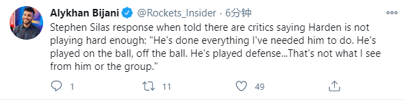 最近几场比赛,哈登得分都不像以前那样疯狂,有人质疑哈登打得不够努力,更有火箭名宿墨菲批评哈登放弃比赛;对此赛拉斯给出回应:“他做到了我要求他做的任何事;他要打有球,也要打无球,他还在场上一直努力防守,我并没有看到他不努力。