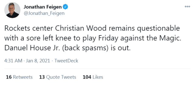 来源:24直播网01-08 09:5424直播网北京时间1月8日讯,火箭官方更新了球队的最新伤情。缺席对步行者一战的豪斯和伍德,依然在球队的伤病名单上。豪斯由于背部痉挛,将继续缺席主场对魔术的比赛,而伍德(左膝酸痛)是出战成疑(questionable,50%上场可能)的状态。