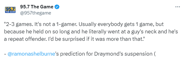 勇士和森林狼二番战开场仅仅只打103秒,汤普森和杰登相互拉拽球衣,格林锁喉戈贝尔导致事态恶化,现场混乱不堪,最终克莱、杰登和追梦都被驱逐离场,追梦因锁喉吃到二级恶意犯规。名记Ramona Shelburne预测格林将禁赛2-3场,通常每个人都会被禁赛1场,但他真的抓住了别人的脖子,他是一个惯犯,若禁赛超过2-3场,我会感到惊讶。