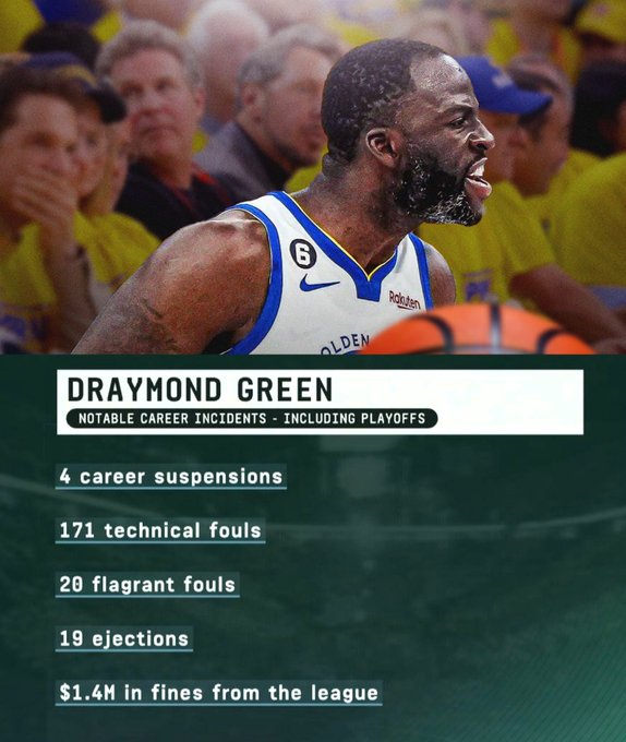 美媒晒出格林生涯劣迹(常规赛+季后赛)——4次被禁赛、171个技术犯规、20个恶意犯规、19次被驱逐和140万美元罚款。