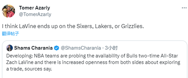 名记Tomer Azarly表示:我认为拉文最终会加盟76人、湖人或者灰熊。