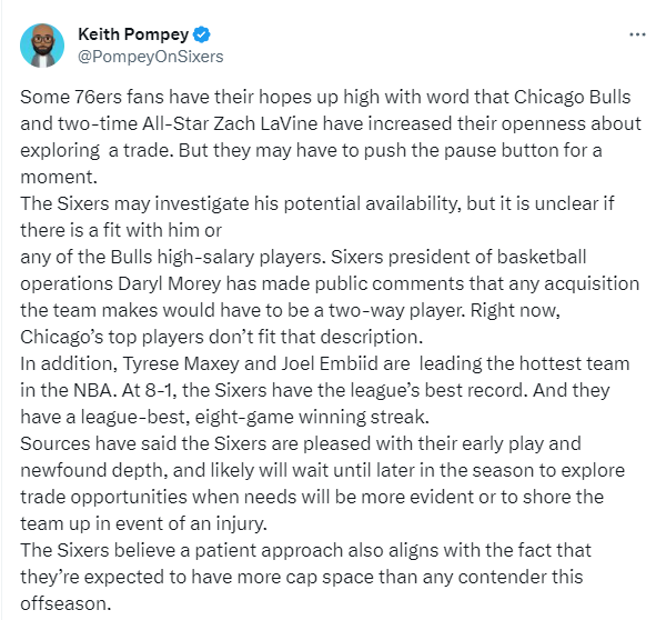 消息人士透露,76人方面目前对球队赛季初的表现和阵容深度感到满意,他们可能会等到赛季晚些时候,当需求更加明显时再去寻求交易,也可能会因伤病做交易。